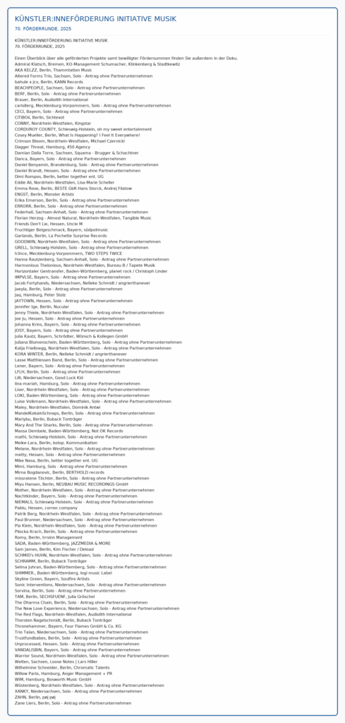 Namen wie Wilhelmine, Crimson Bloom, The Red Flags oder BEACHPEOPLE zeigen, wie unterschiedlich die geförderten Projekte klingen — und dass die Initiative Musik nicht nach Genre, sondern nach Potenzial fördert.
